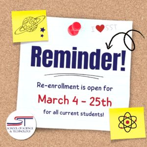 Dear SST Parents, Re-enrollment for the 2026–2027 school year is now open from March 4, 2026, through March 25, 2026. Re-enrollment is essential for