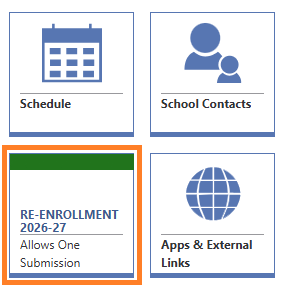 On the main dashboard, scroll down and look for the “RE-ENROLLMENT 2026–27” tile — the same tile shown in the screenshot below.